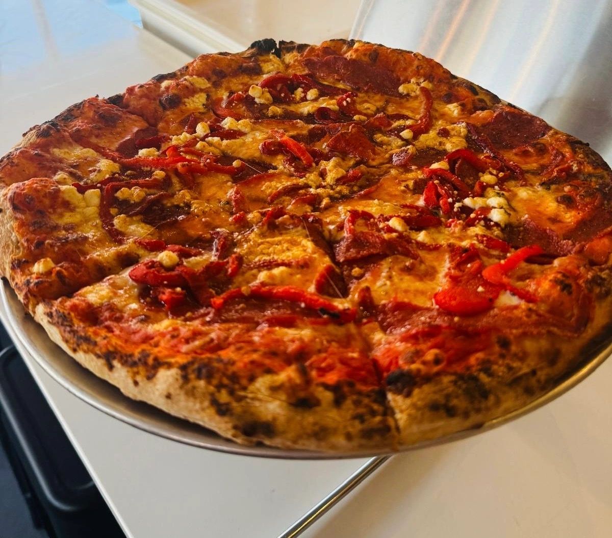 A smooth blend of tomato and cream sauce forms the base, topped with spicy salami, roasted red peppers, mozzarella, and creamy dollops of goat cheese — all finished with a light sprinkle of smoked paprika.